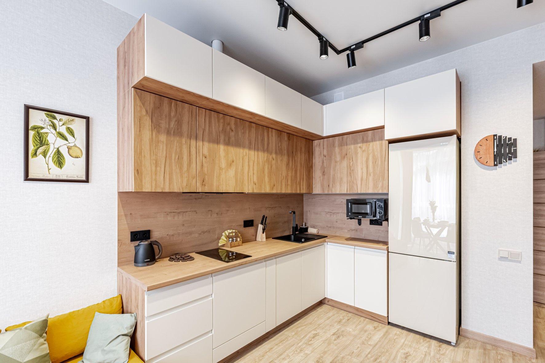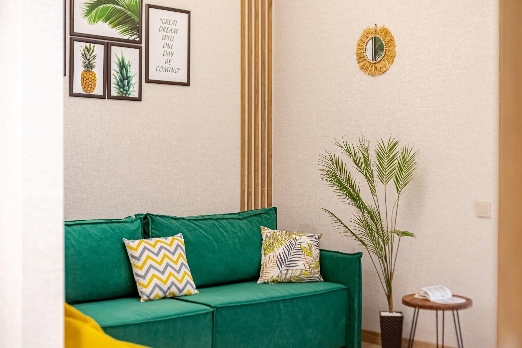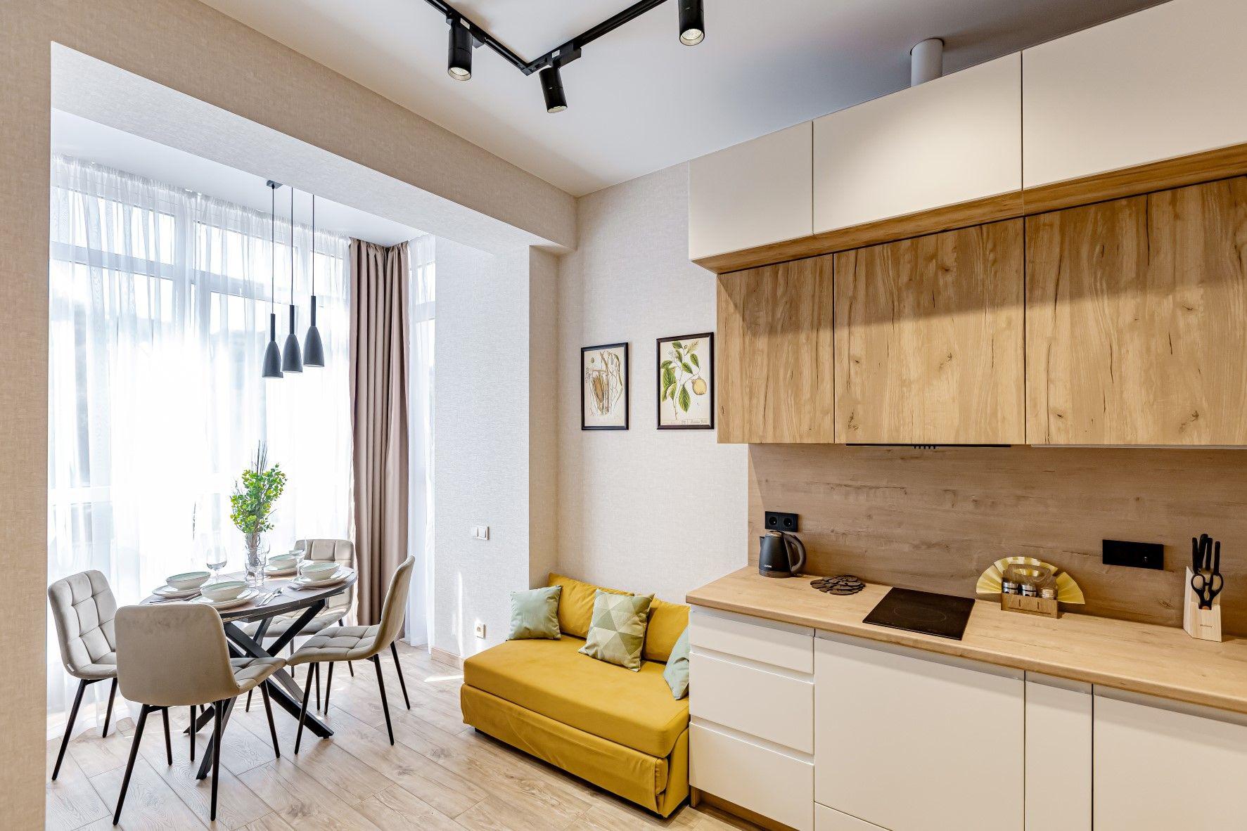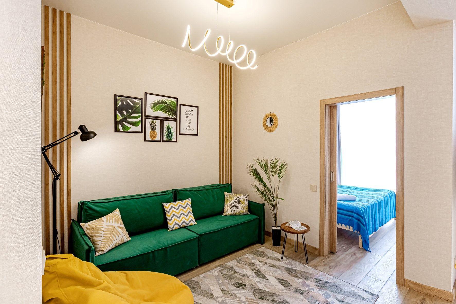 🔹 В спальне у нас находится большая кровать с ортопедическим матрасом, в гостиной–студии удобный раскладной диван, причем в отдельной зоне. Кухню оборудовали всей необходимой бытовой техникой, полным комплектом посуды и маленьким диванчиком. Здесь хочется вкусно готовить, вместе всем кушать и проводить время, к примеру играя в настолки.